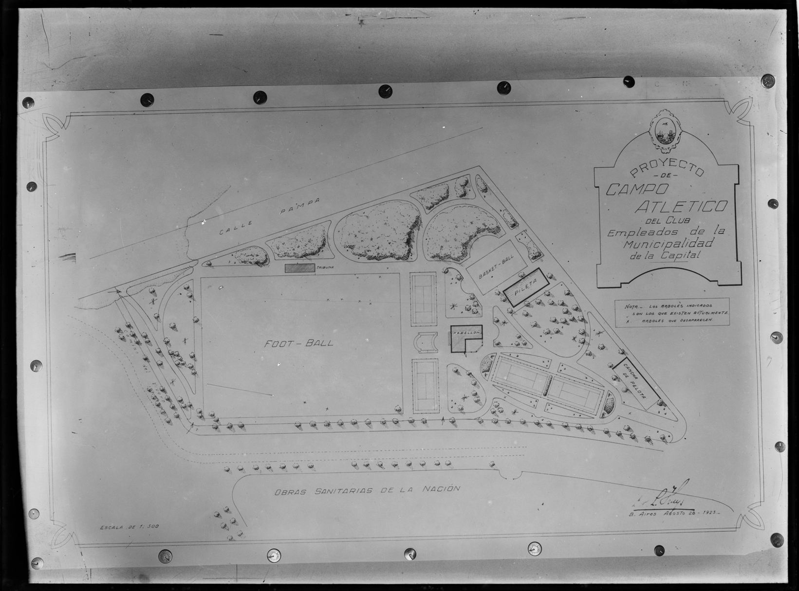 Estudios y Proyectos. Reproducciones de planos. Proyecto de campo atlético. Club de empleados municipales