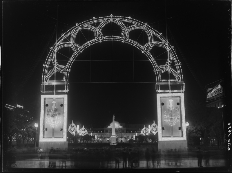Dirección de Alumbrado. Con motivo de la visita del Presidente del Brasil Dr. Vargas. Fotografías de la iluminación. 25 de mayo de 1935. Arcos sobre Plaza de Mayo