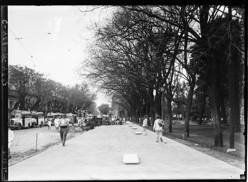 Parques y Plazas. Plaza Pueyrredón. Flores. Primeros trabajos. Vereda y banco