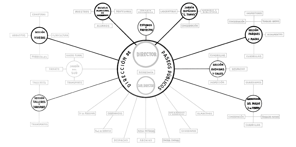 Las fotografías de la Dirección General de Paseos Públicos registran las actividades llevadas a cabo por esta repartición municipal que tuvo clara incidencia tanto en la morfología de los espacios libres como en los aspectos humanos y vivenciales relacionados con ellos. Las imágenes fueron producidas por el Gabinete fotográfico creado en 1916 con el propósito de producir el relevamiento sistemático de sus tareas principales: creación y mantenimiento de plazas y parques, instalación de monumentos, alumbrado, ornamentaciones para festividades, relevamiento de especies existentes en el Jardín Botánico, obras en vías públicas, así como actividades y trabajos a cargo de otras reparticiones.