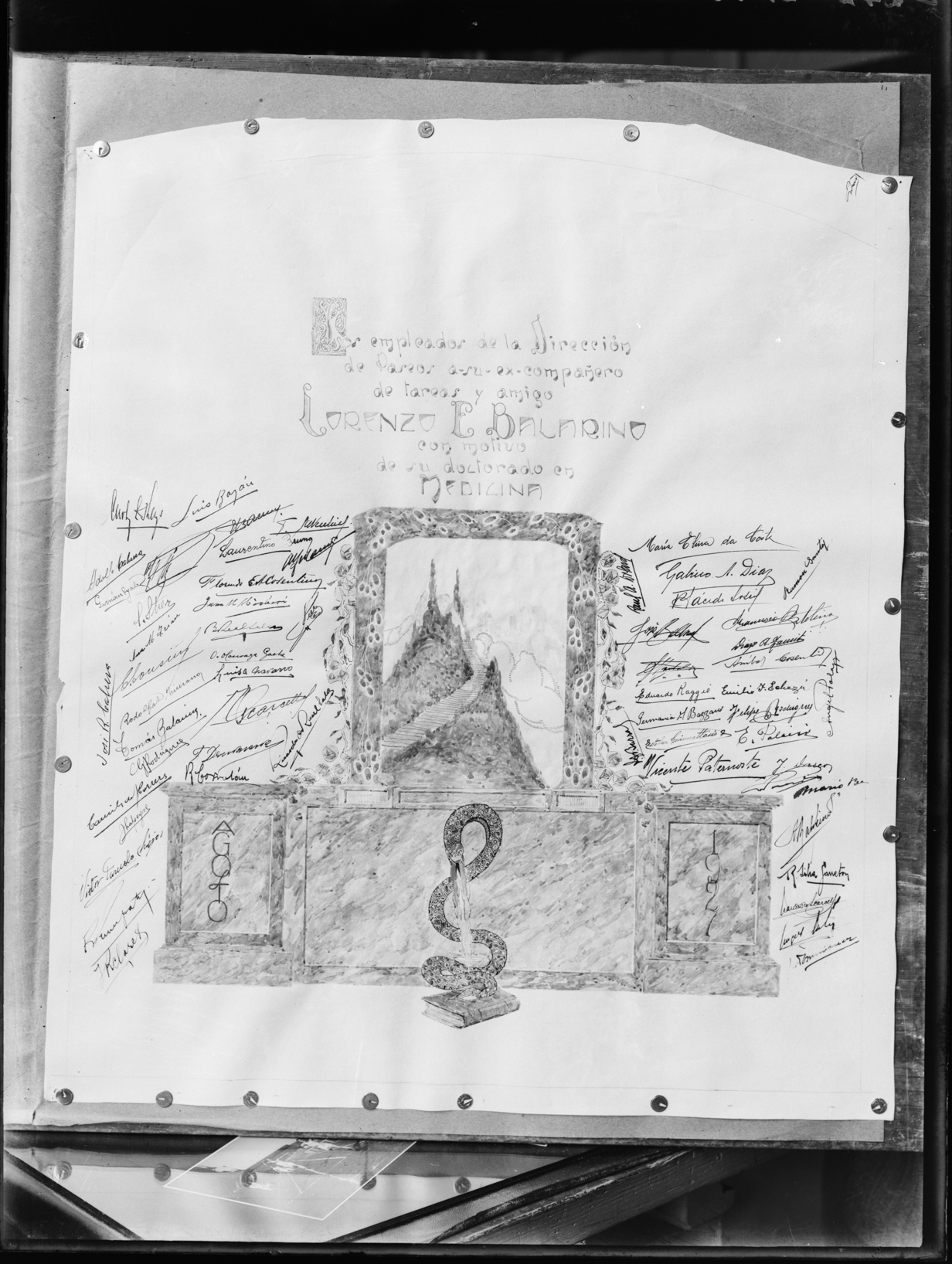Estudios y Proyectos. Varios. Pergamino de los empleados de la Dirección de Paseos a los ex compañeros Balarino y Cabrera