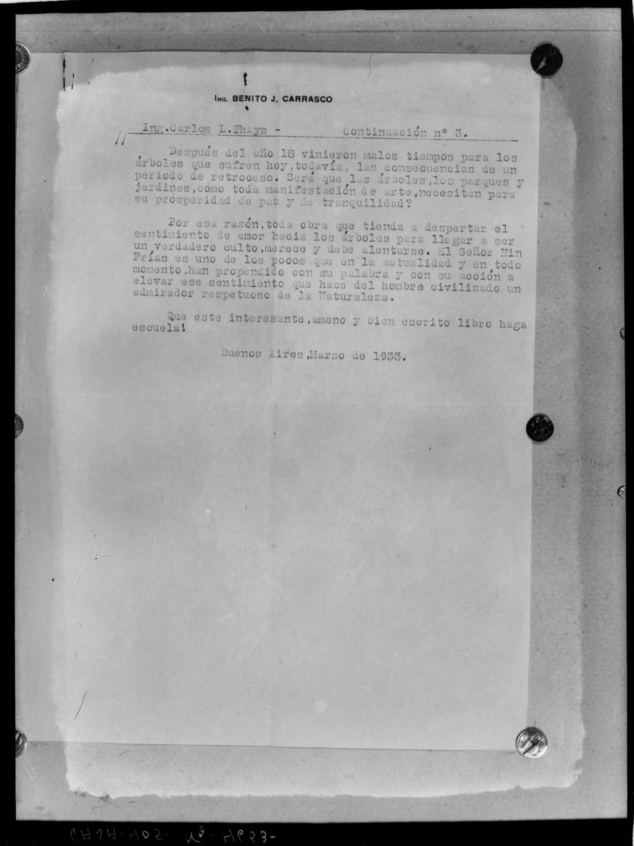Varios. Reproducción carta del ingeniero Benito Carrasco al ingeniero Thays por el libro "El culto al árbol"
